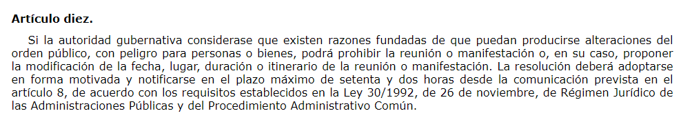 15 de julio están contemplados los únicos motivos por los cuales se puede prohibir una manifestación, (y explicita "de que puedan producirse alteraciones del orden público", el auto 40/2020, de 30 de abril del TC, inadmitió a trámite el recurso de amparo del sindicato CUT a la