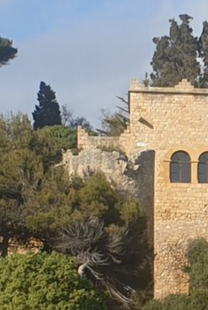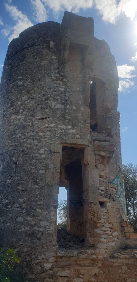 L'alçada no es pot saber con exactitud falta la part superior, entrada original a l'alçada del 1 pis protegida amb un matacà, actualment quasi coberta pels pins. 1 foto fa uns anys, 2 actual.