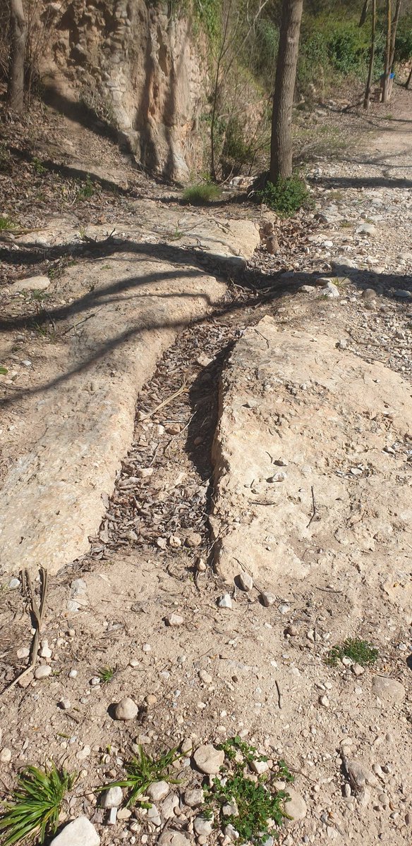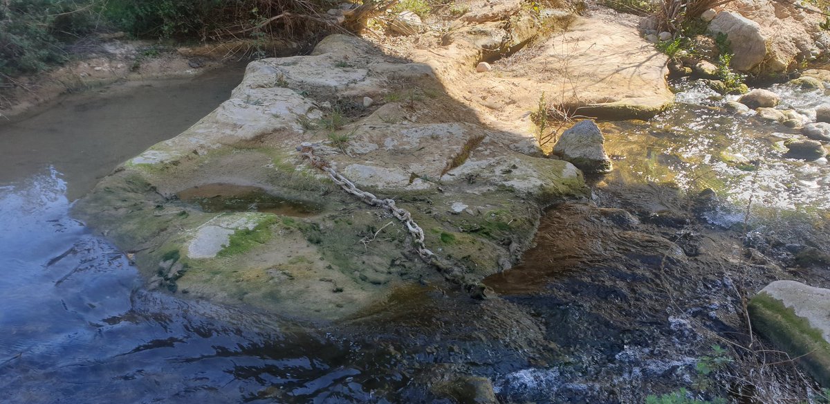 Mira i veuras moltes coses, cadena clavada en una roca d'una passera?, resclosa, antigues sèquies excavades a la roca, bosc de rivera.
