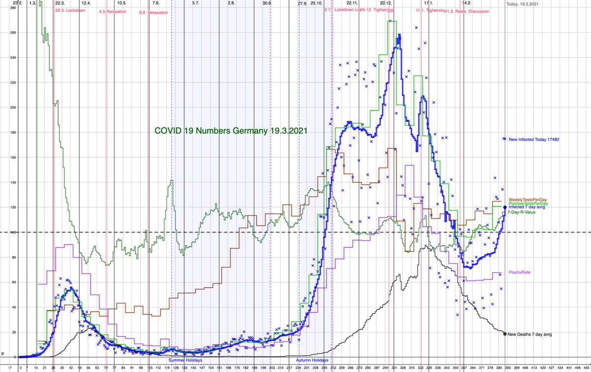 Corona-Update 19.3.2021: Die 7-Tage-Fallzahlen (blaue Treppe) stiegen um 31% gegenüber der Vorwoche auf 83.969, von 63.259, rund 20.000 mehr. Zahl der Toten (schwarze Treppe) sank, deutschlandweit um 17%.