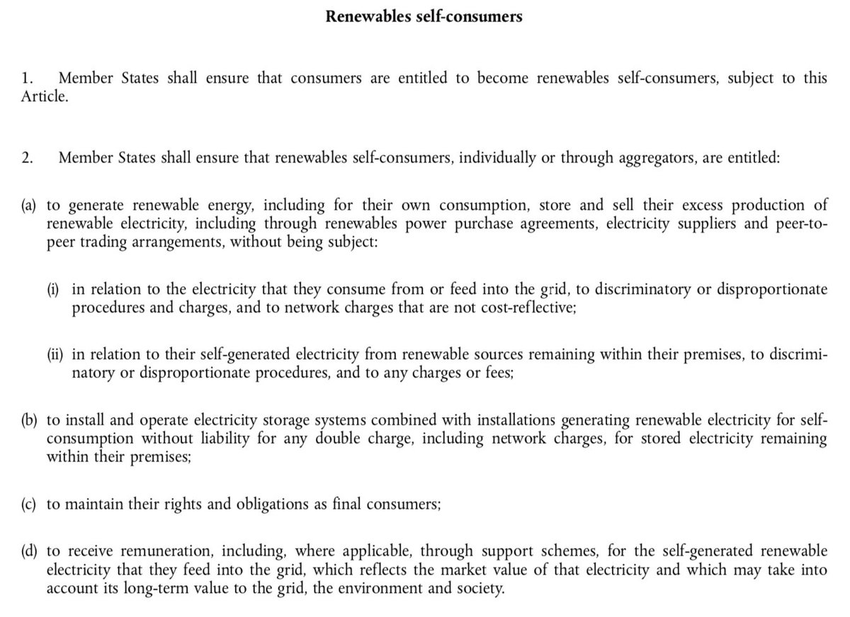 5/ Når det gjelder retten til å produsere egen energi, så er den nedfelt i EU-direktiv 2018/2001 "On the promotion of the use of energy from renewable sources" hvor hovedregelen er at det er lov, art.21-1: "consumers are entitled to become renewables self-consumers"