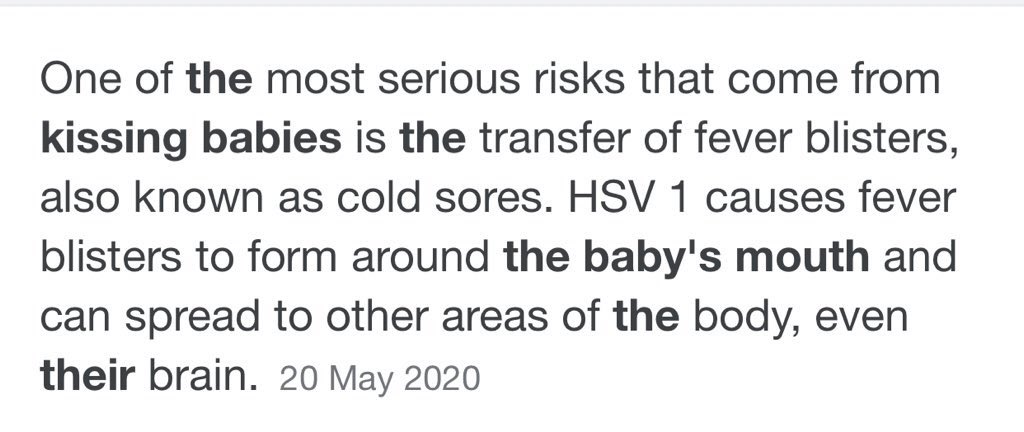 -By kissing babies people can transfer fever blisters which can form around their mouth and then spread to other parts of their body even their brain as their immune system is still fragile. Protect your babies.