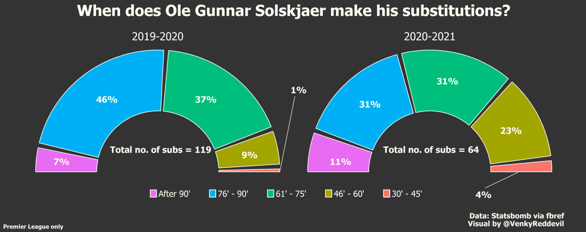 Ole was often known to make all/most of his changes at the same time last season. However, this season Ole tends to spread the use of substitutes very well with the manager at least making one early change as indicated by the increase in % between minute 46’ and 60’.