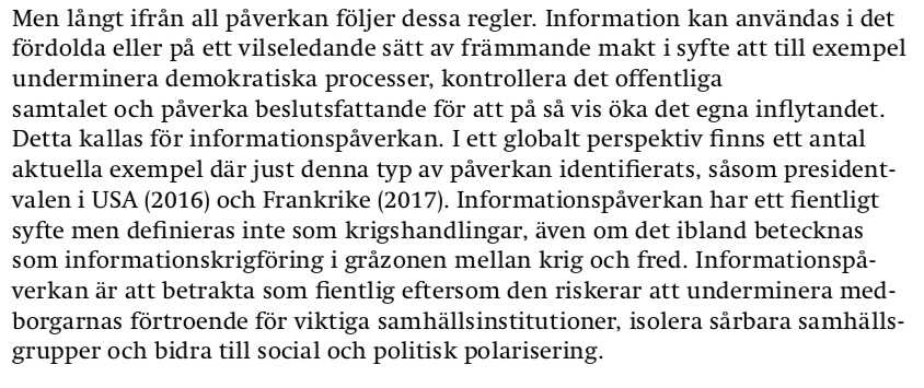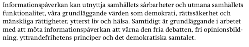 02/ "Påverkanskampanjer något vi behöver försvara oss emot för att värna målen för Sveriges säkerhet; befolkningens liv och hälsa, samhällets funktionalitet och förmågan att upprätthålla grundläggande värden som demokrati, rättssäkerhet och mänskliga fri- och rättigheter.”