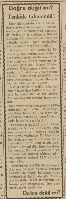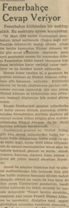 Bu laçkalığa, Fenerbahçe üyesi olan Nüzhet Abbas da isyan etmiş ve Cumhuriyet gazetesine bir yazı yazmış.