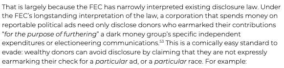 Broadening reporting requirements is only half the battle. Under the FEC’s current interpretation of the law, when dark money groups do file FEC reports, they generally only disclose their SPENDING, but not the group’s DONORS.