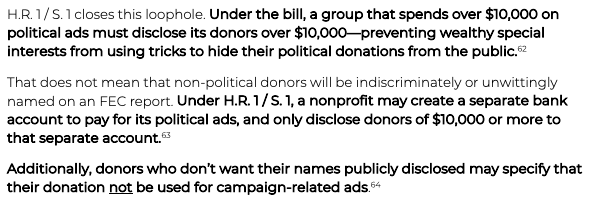 Finally, the #HR1/#S1 transparency provisions ONLY apply to big donors who give over $10K. Moderate amounts given by regular Americans won’t be made