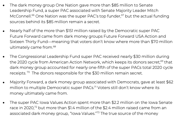 For example, dark money groups gave $660M to super PACs in 2020: the super PACs disclosed the dark money groups as donors, but whomever gave the money in the first place remained secret.