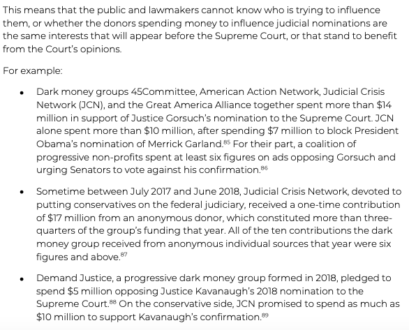 Finally, Supreme Court confirmation battles have attracted huge dark money spending, but none of that spending is subject to disclosure.