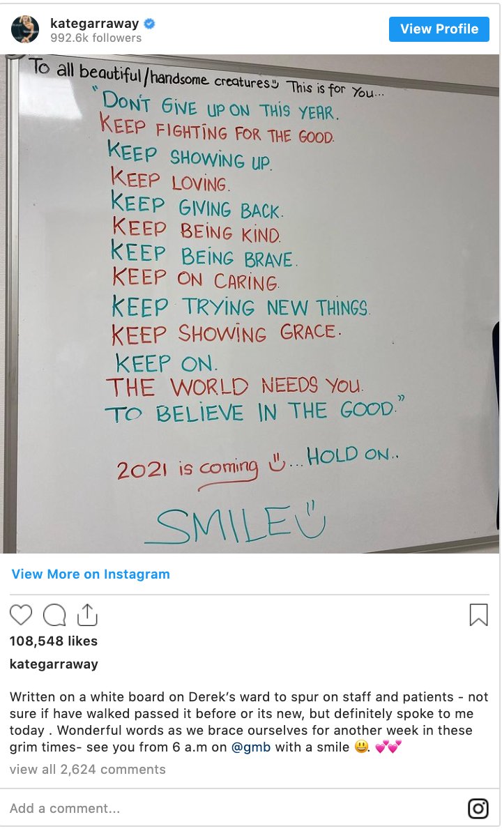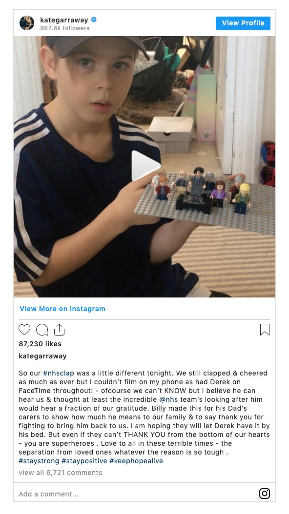 👏 Throughout Derek’s battle with the virus, Kate paid several tributes to NHS staff who were caring for him, and shared an emotional clip of her, and her family, taking part in the final clap for carers. She also revealed that her son Billy sometimes sleeps by Derek’s empty bed