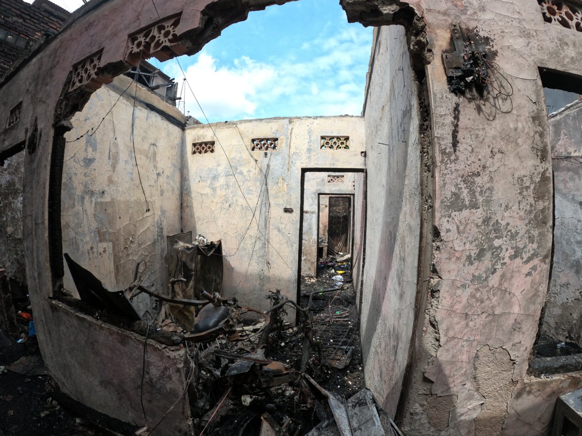 Atap kontrakan sudah tidak ada. Pecahan beling terlihat berserakan. Sejumlah perabotan, mulai meja, lemari, kursi, hancur. Tiga sepeda motor yang berada di depan kontrakan hangus. #kebakaranMatraman