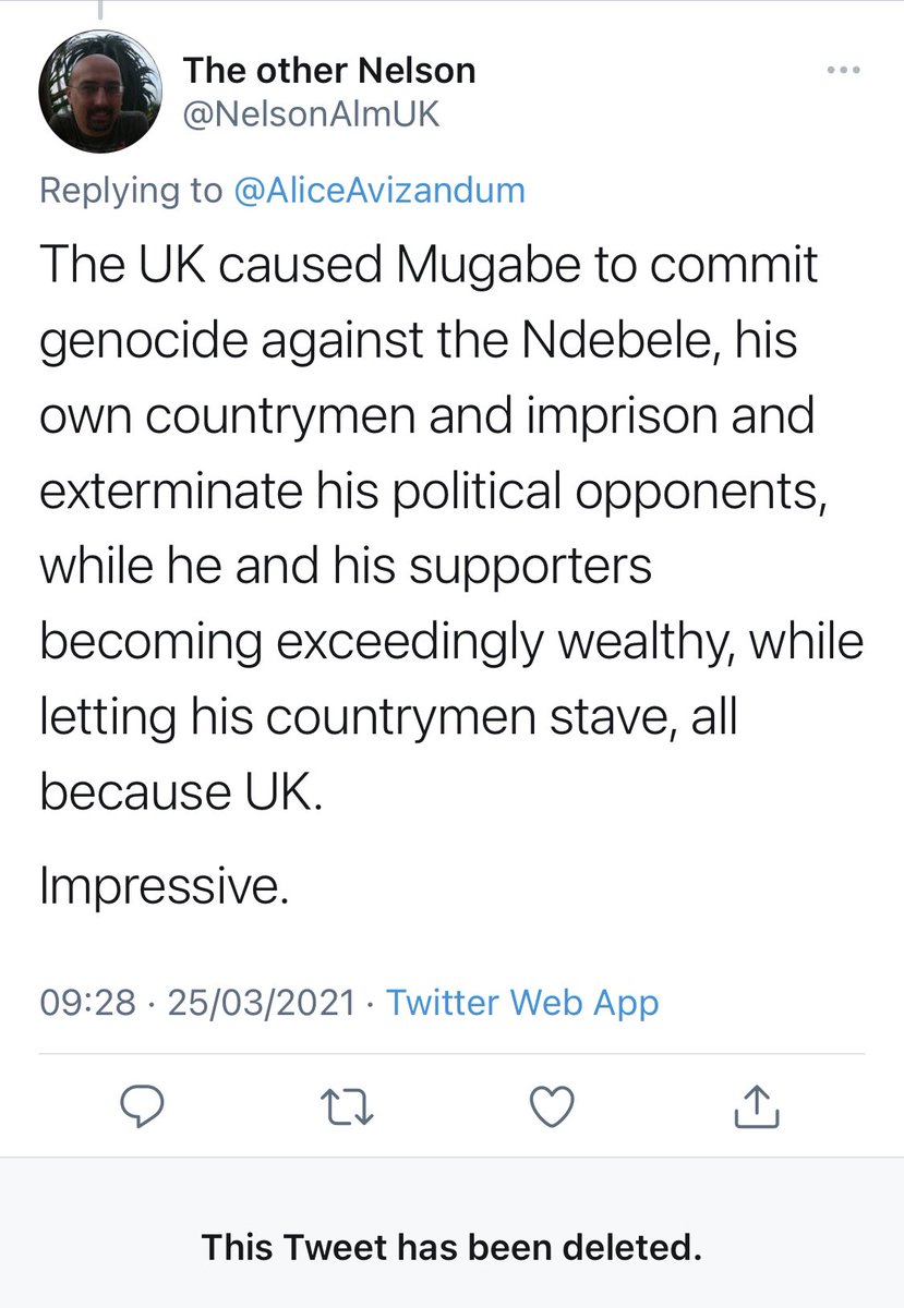 what responsibility could we possibly bear for the genocide or personal corruption of Robert Mugabe, a man who rose to power fighting a former British colony aided by a second former British colony, the latter of which continued to try to destabilise his country for years