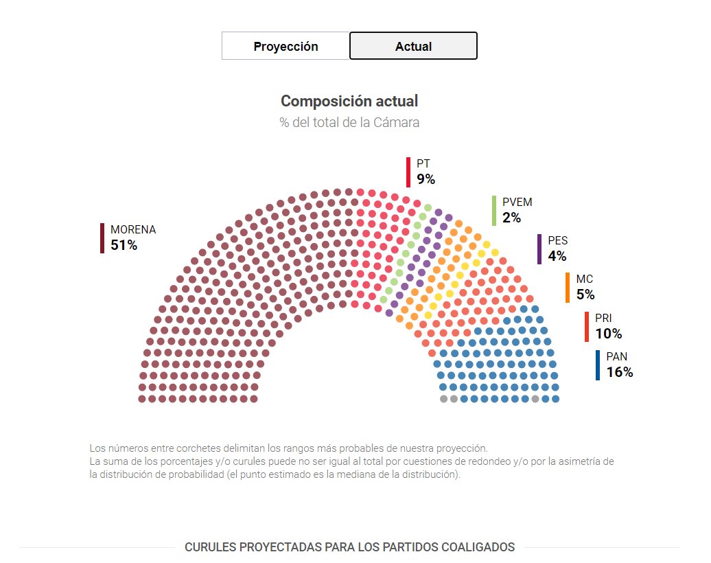 Hasta ahora, las encuestas muestran que Morena obtendría mayoría simple en la Cámara de Diputados. Si se le suma a sus aliados, obtendría 66% (dos terceras partes).