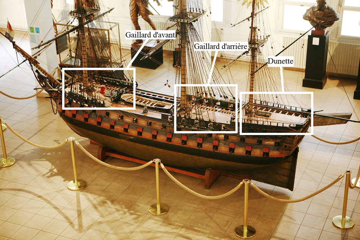 Au XVIIIe siècle, le niveau supérieur des vaisseaux se divisait en gaillard d’arrière et gaillard d’avant, ceux-là étaient reliés par des passavants et étaient donc partiellement armés.
