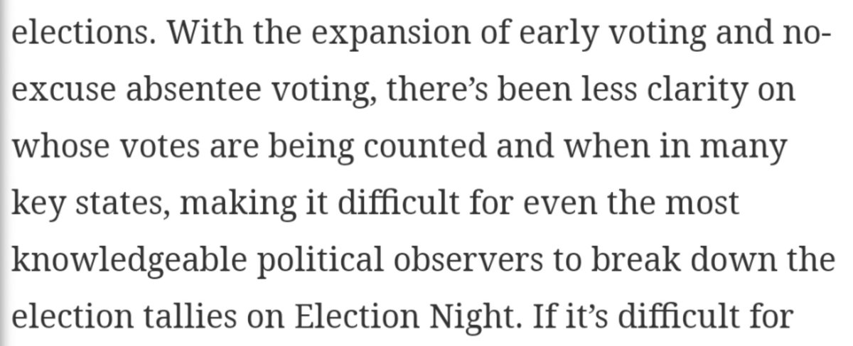 And this whole "less clarity on whose votes are being counted and when" garbage is just a gussied-up way of promoting the *lie that expanding early and absentee voting facilities fraud.