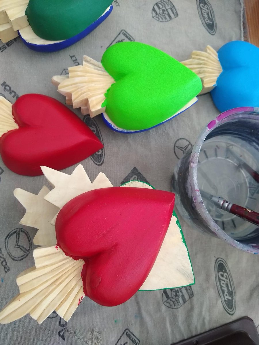 Taller de corazones de madera tallados y pintadas a mano.