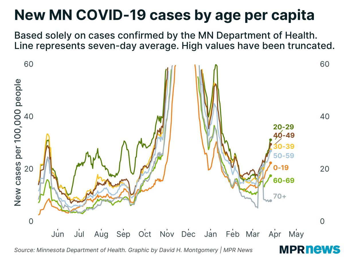 About 80% of Minnesota seniors, 1/3 of Minnesotans 50-64, 20% of adults 18-49, and a small share of 16- and 17-year-olds have at least one dose.