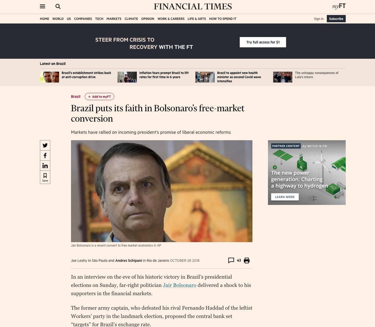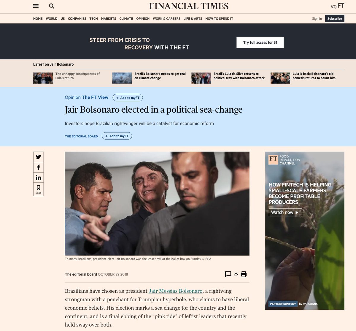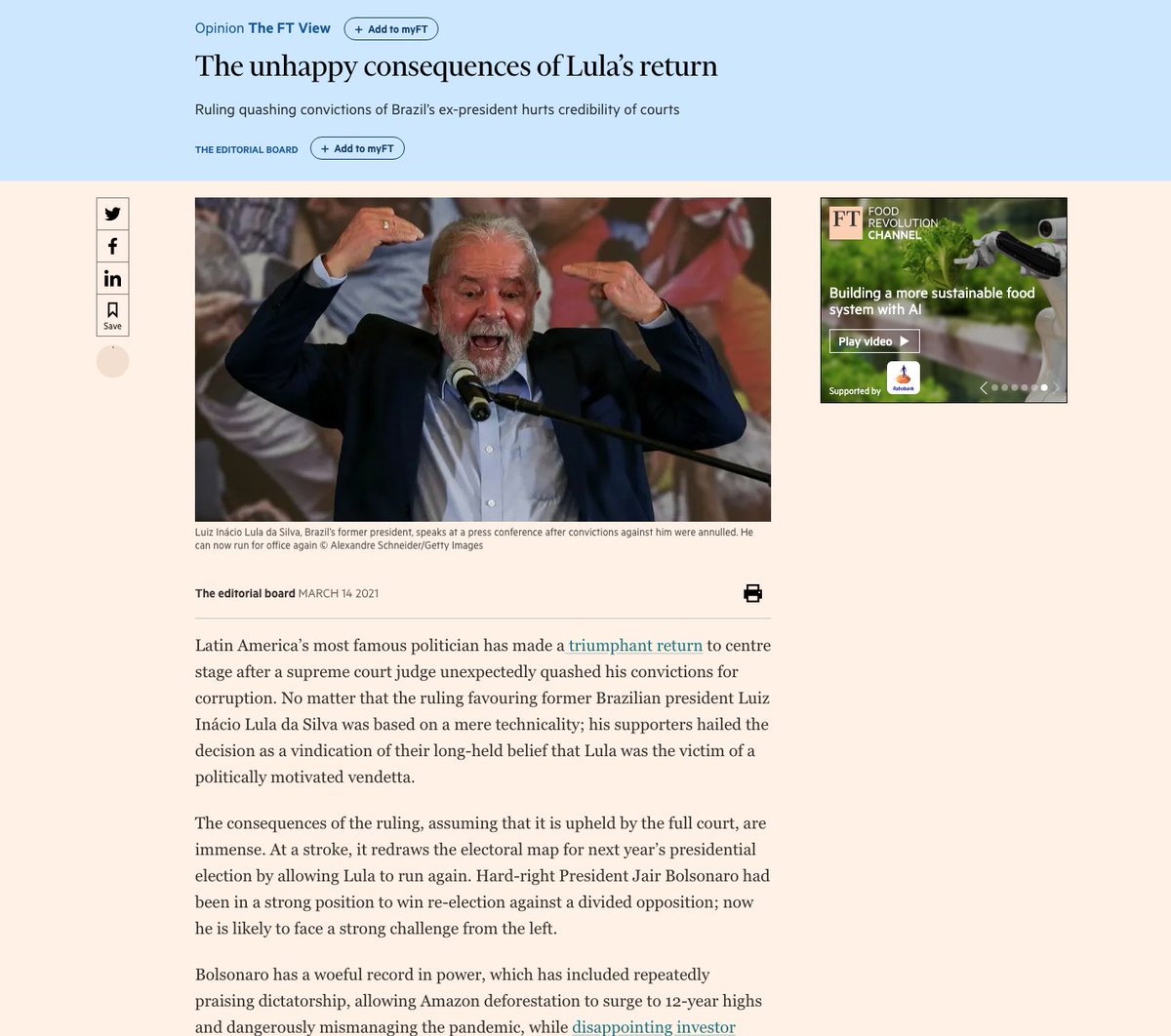 Para entender qué intereses representa el FT, basta leer las odas que escribían sobre el fascista Jair Bolsonaro, quien condujo a Brasil a un desastre social gigantesco, y el desprecio por Lula, quien volvió a la escena política tras el fraude de 2018.