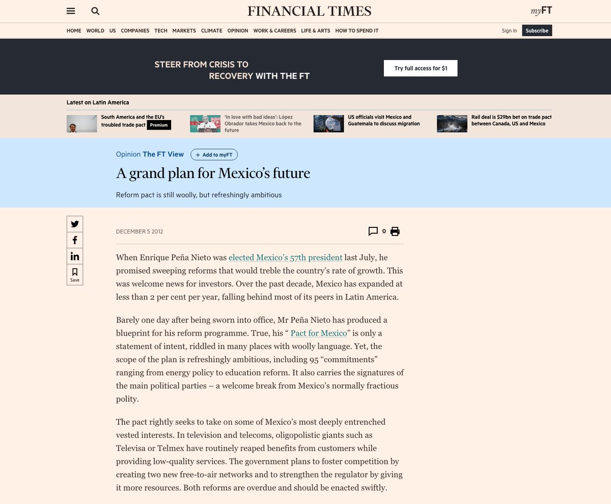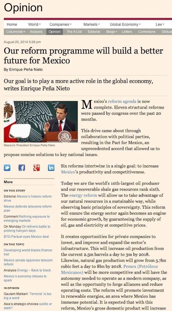 "Un gran plan para el futuro de México", escribió el FT en un editorial tras la llegada de Peña a la presidencia. 😆