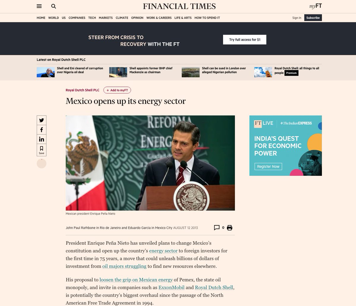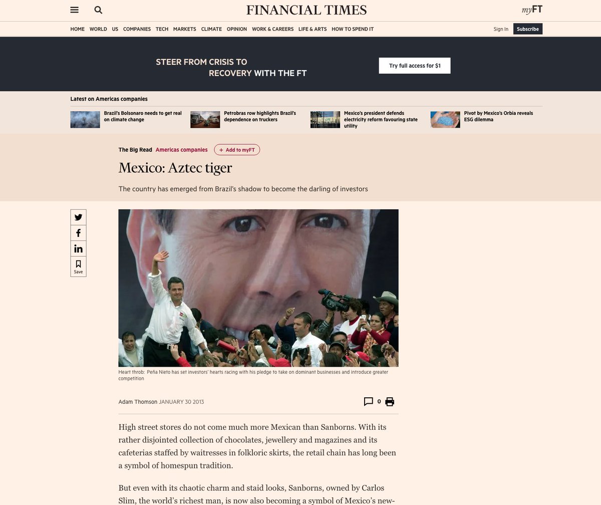 O para no ir más lejos, hay que leer las odas que escribía el FT a la desastrosa reforma energética de Peña, "el tigre azteca". 🤣