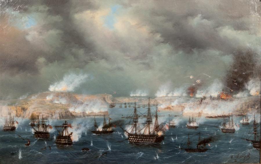 Troisième acte. Le 17 octobre 1854, la flotte alliée arrivée devant Sébastopol bombarda les forts protégeant le port russe. Les navires franco-britanniques, en bois, subirent d'importants dommages durant cette attaque inefficace. Peinture d'Adrien Champel.