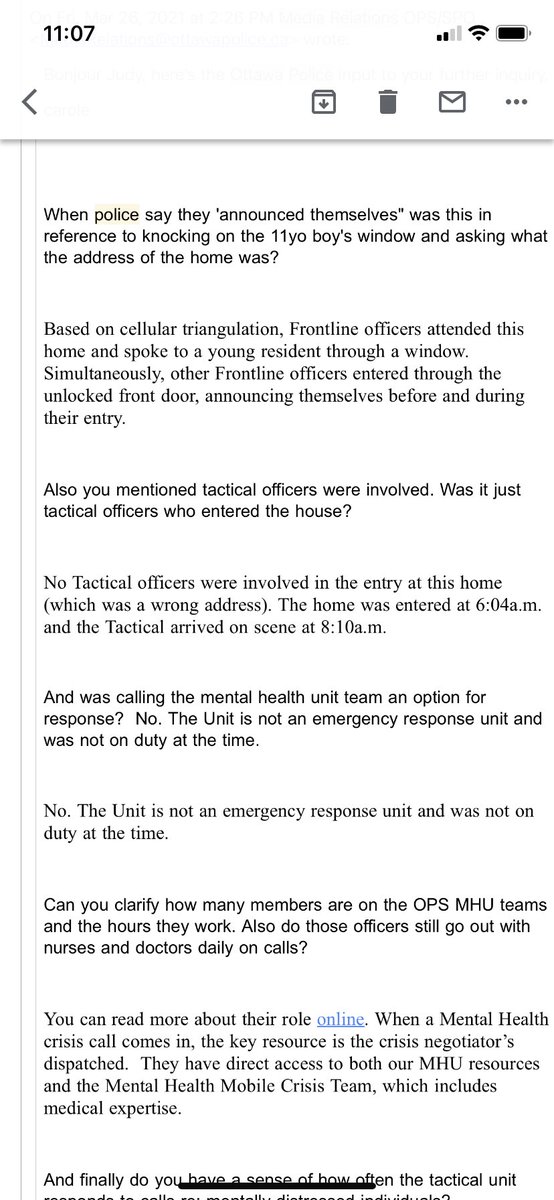 The Ottawa Police say this wasn’t a dynamic entry. They say their tactical officers did not enter the house but arrived later to support patrol officers. Here’s an email exchange with OPS media relations. Despite having a mental health unit- they do not respond to emergency calls