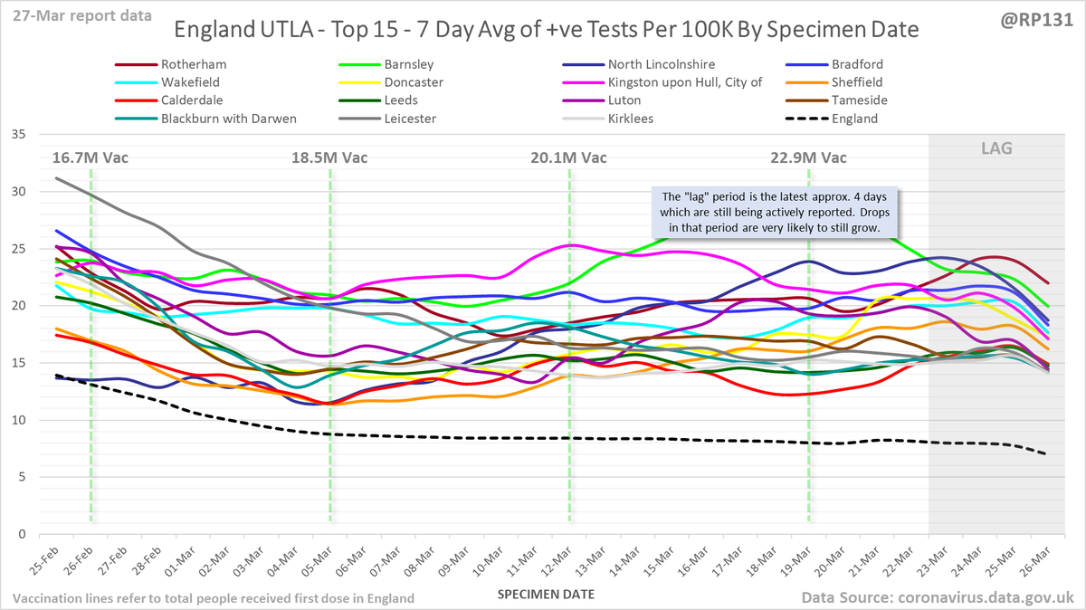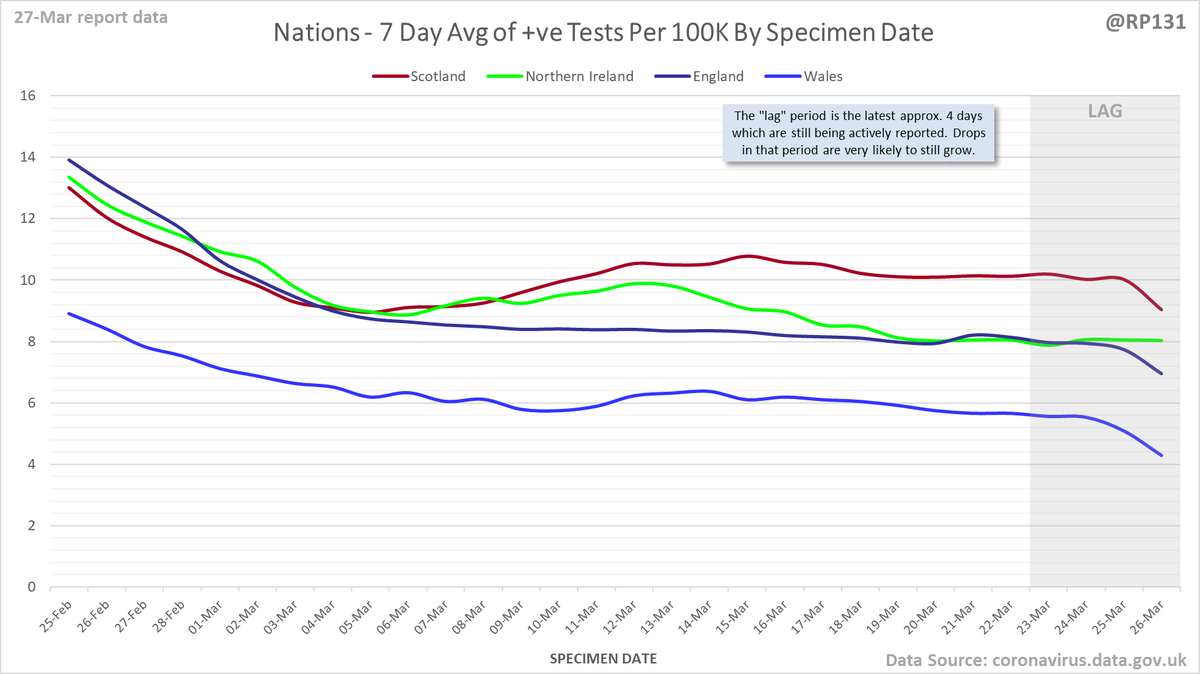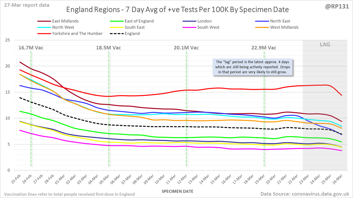 #covid19uk - Detailed positive tests thread. The majority of this thread is a set of views of rolling 7 day average positives per 100K by specimen date. Starting with England regions: