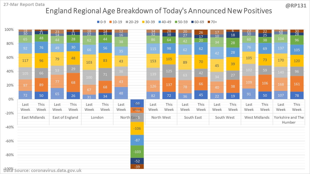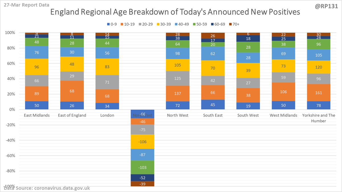 Regional / age distribution of today's newly announced positives for England.