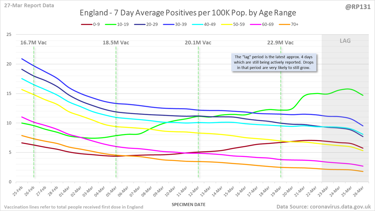 England rolling average positives (per 100K population) by age range: