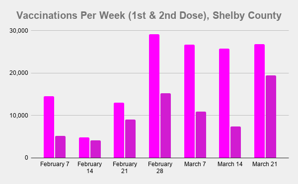 We administered 26,835 first doses + 19,410 second doses, for a total of 46,245 total doses this week. This is a significant increase, mainly driven by 2nd doses.