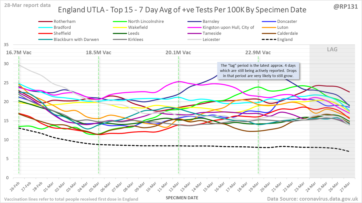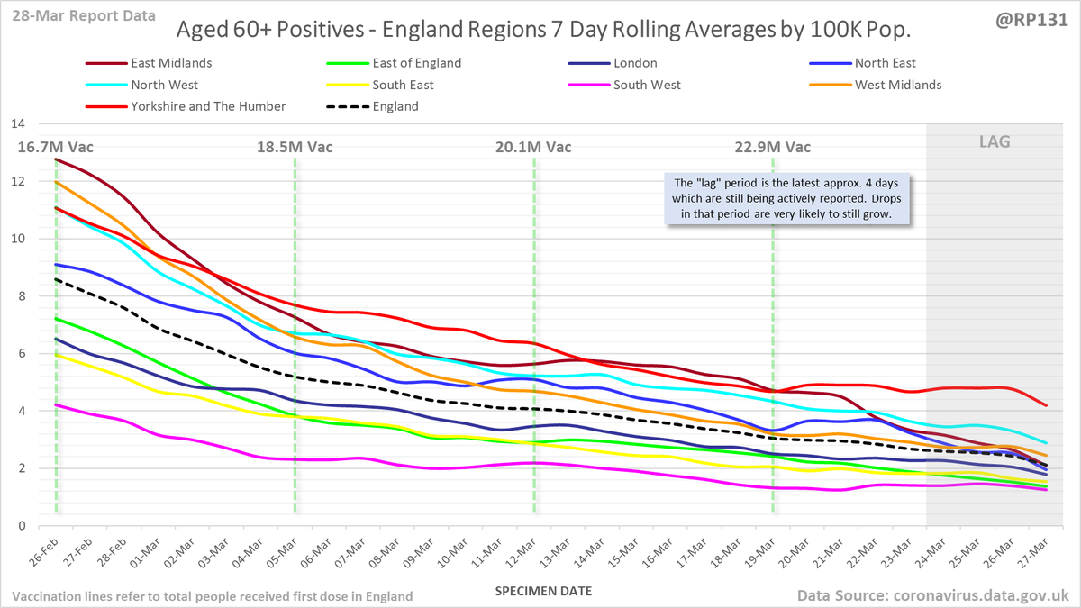 #covid19uk - Detailed positive tests thread. The majority of this thread is a set of views of rolling 7 day average positives per 100K by specimen date. Starting with England regions: