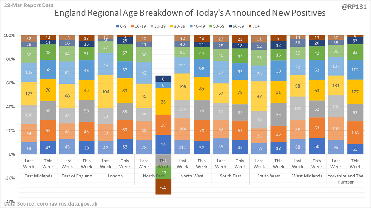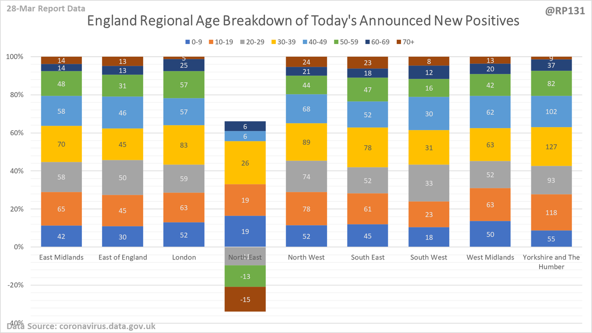 Regional / age distribution of today's newly announced positives for England.