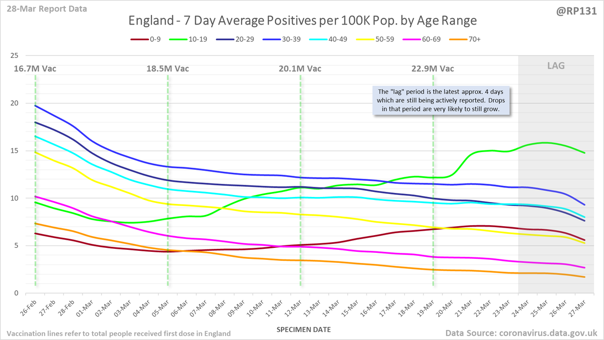 England rolling average positives (per 100K population) by age range: