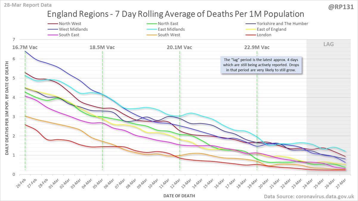 Date of death chart for England regions drawn with 7 day rolling averages of deaths per 1M population.