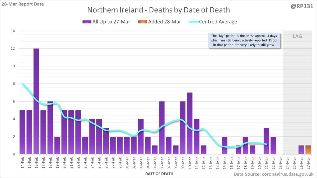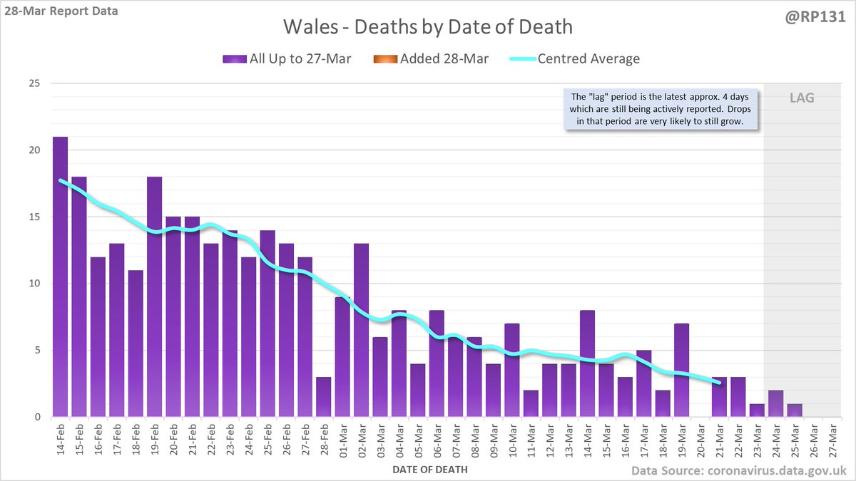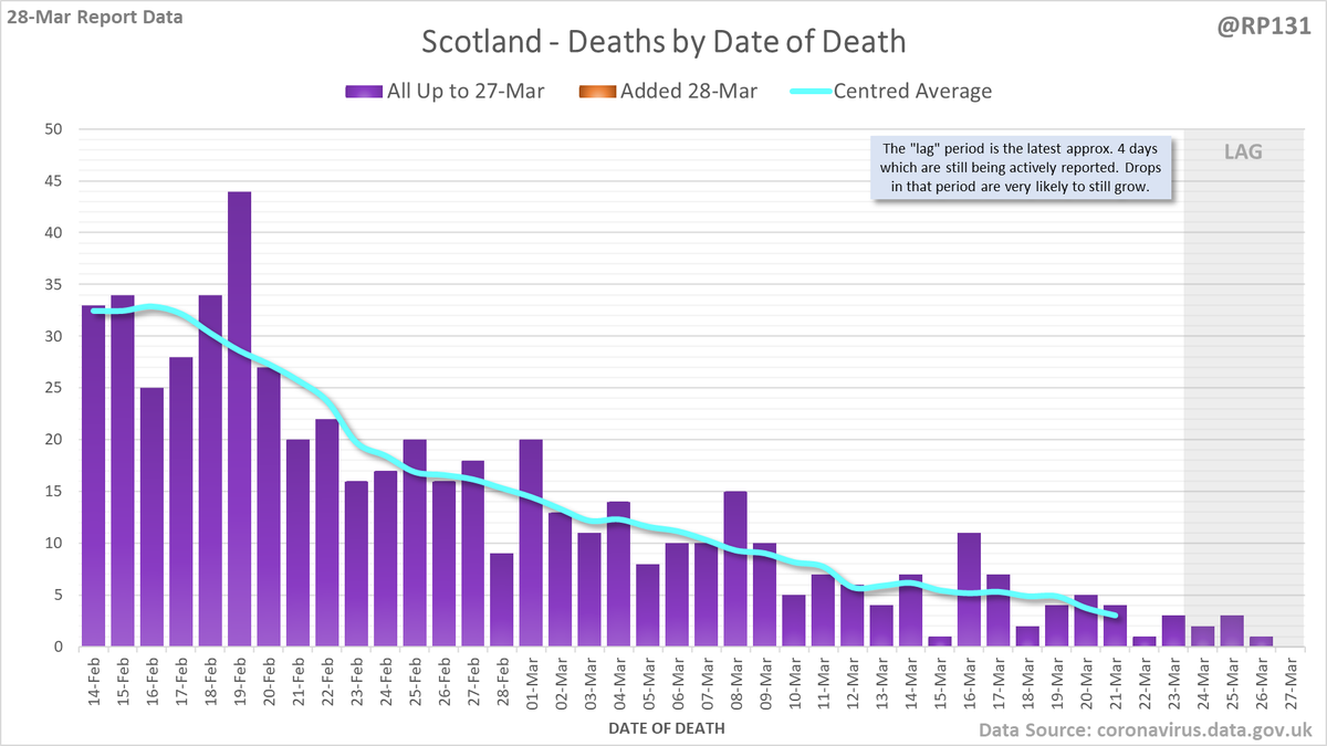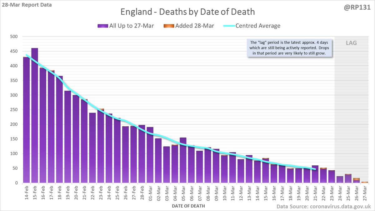 19 new #covid19uk deaths reported today (28-Mar). This brings the rolling average by date of death (allowing 4 days for lag) to 54 - which is a reduction of 41% in the last week and the lowest since 28-Sep (i.e. 174 days ago).