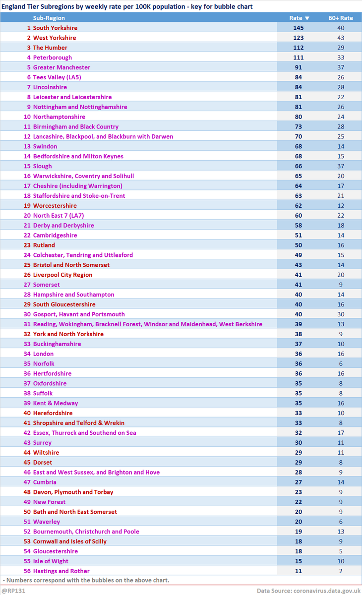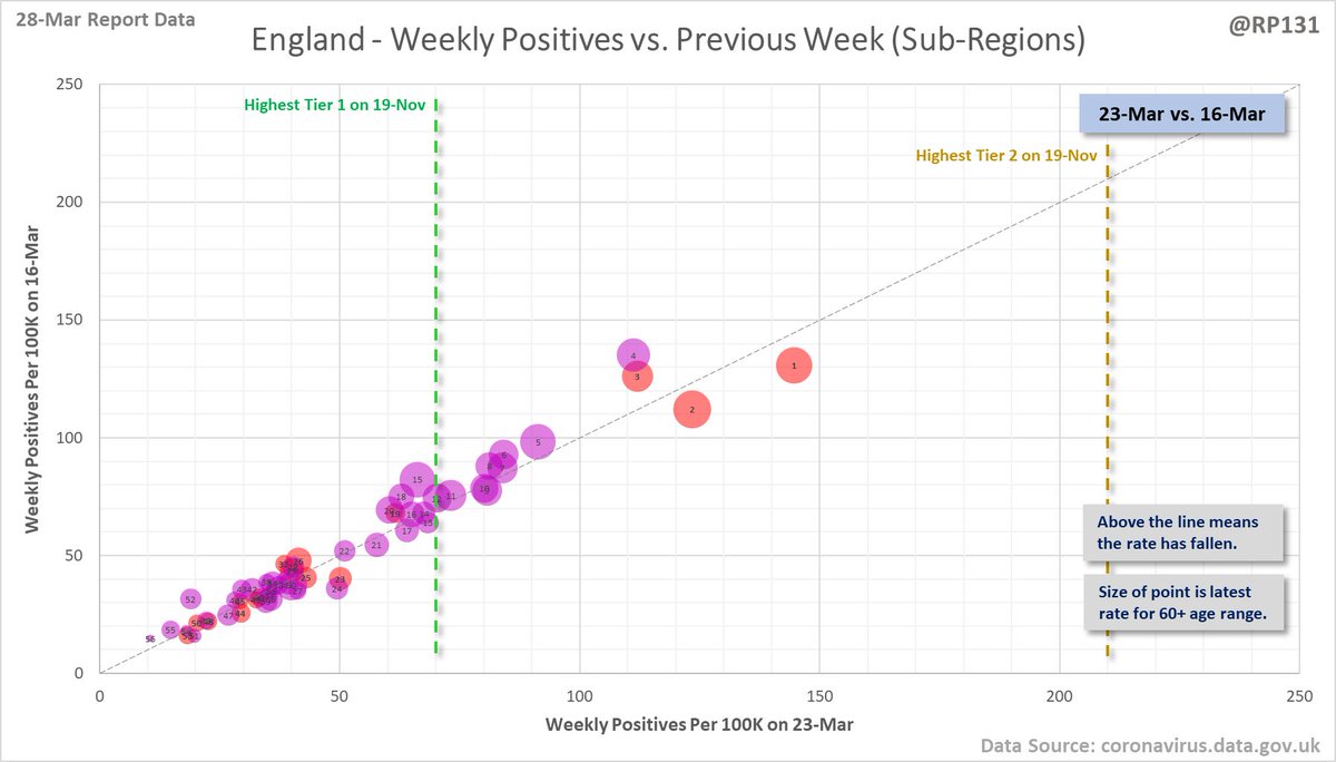 Bubble chart (Tiers / Sub-region) thread. This type of chart allows us to compare week on week changes by seeing if the points are above or below the dotted line. This version is grouped by "sub-regions" as were previously used for assigning tiers: