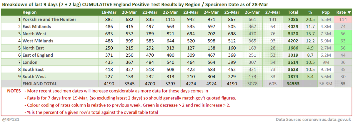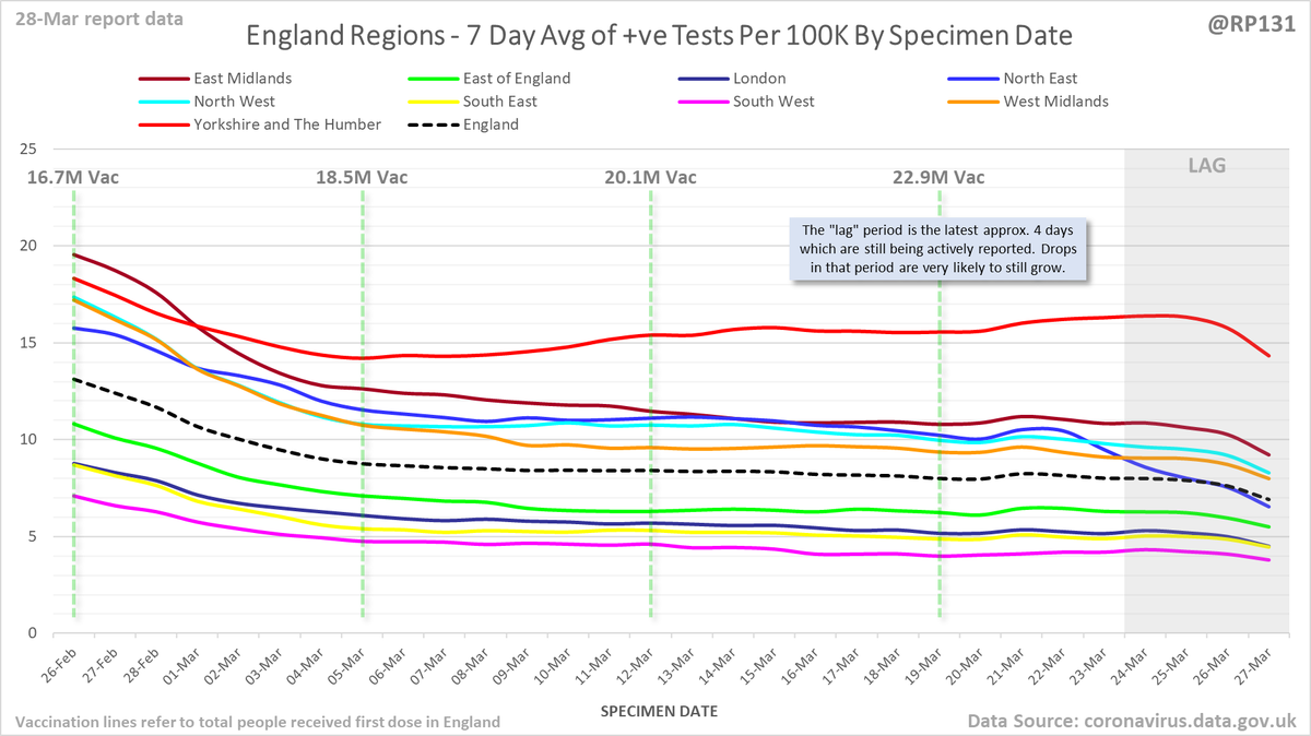 #covid19uk - Detailed positive tests thread. The majority of this thread is a set of views of rolling 7 day average positives per 100K by specimen date. Starting with England regions: