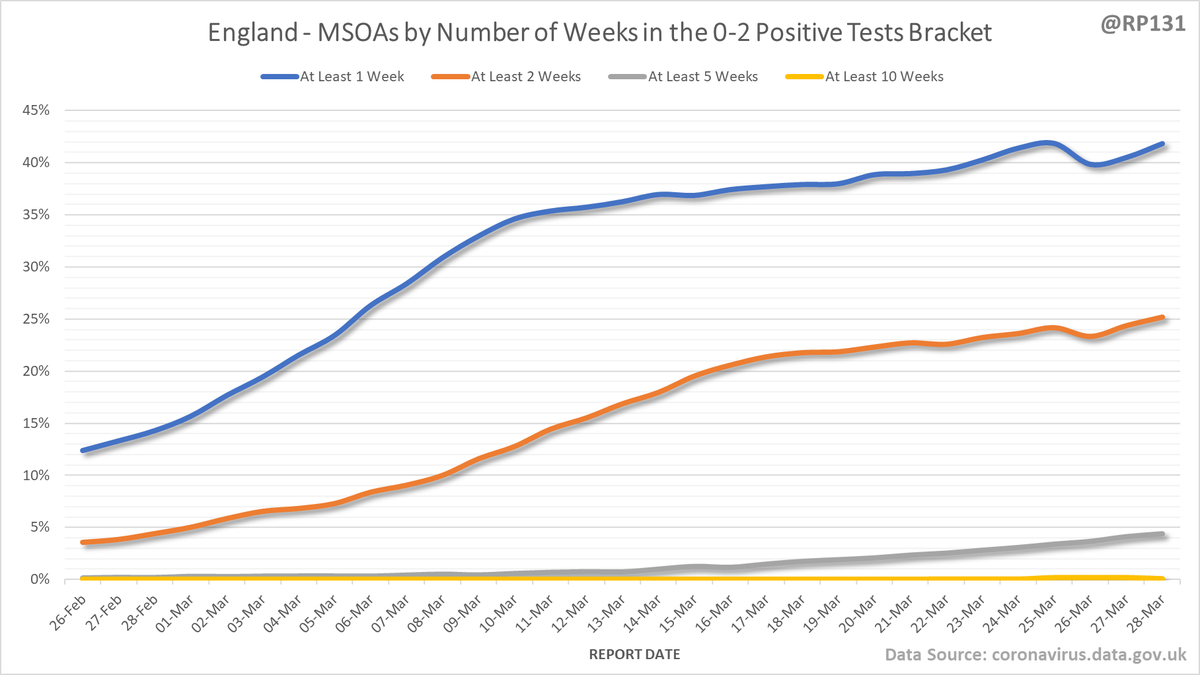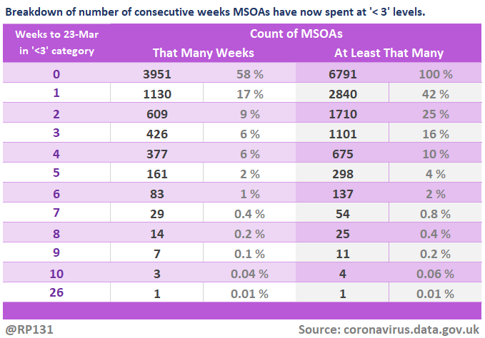 Bringing back the view of how many weeks the MSOAs have been in the suppressed 'less then 3 +ves in the last week' category. Since they don't allow us to distinguish between zero / 1 / 2, we generally consider it to mean zero. Link to full table in reply below.