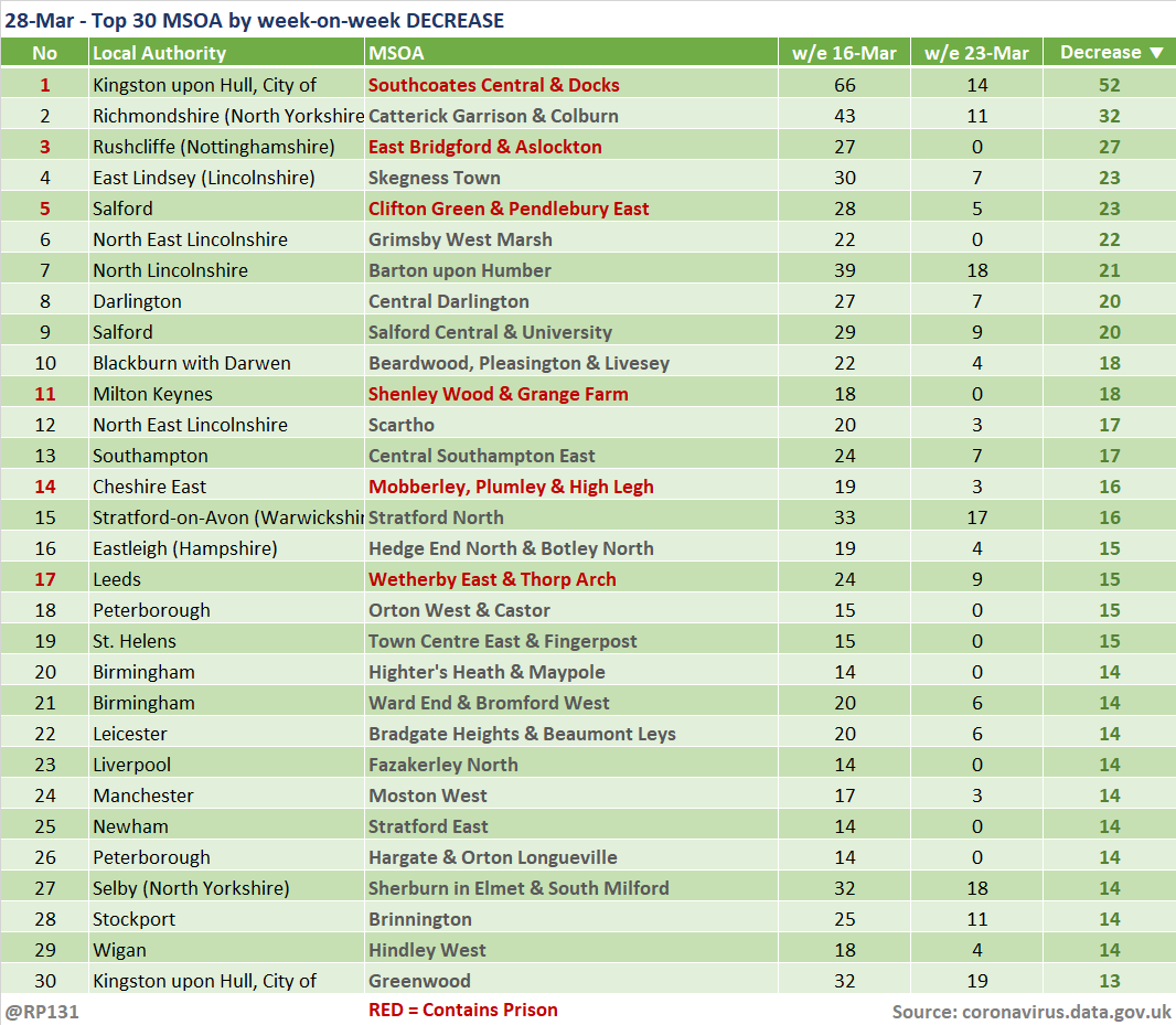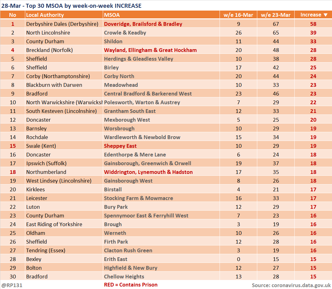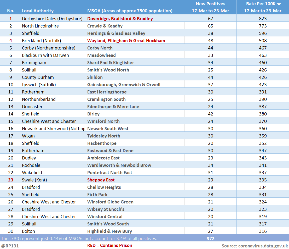 Updated table of top 30 MSOAs (by rate) based on latest numbers in today's report.