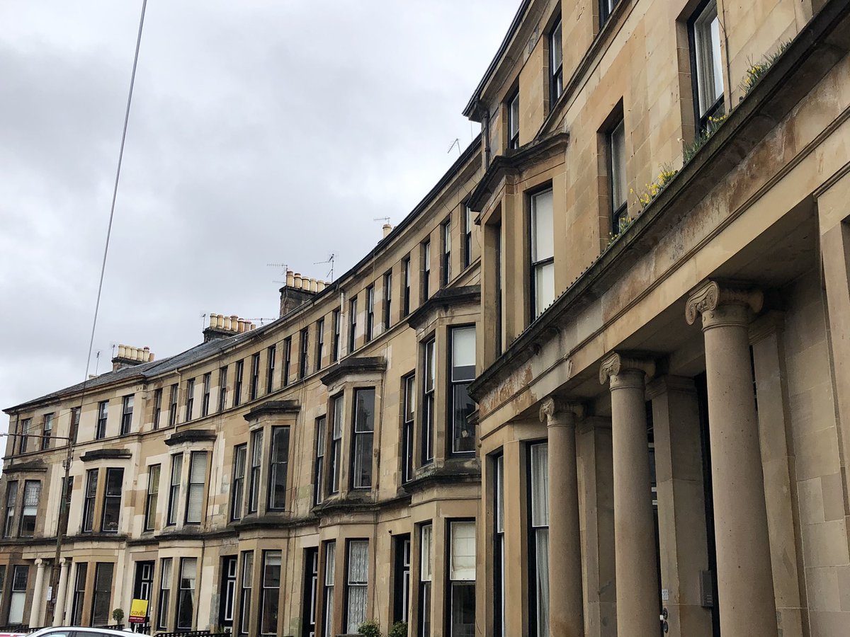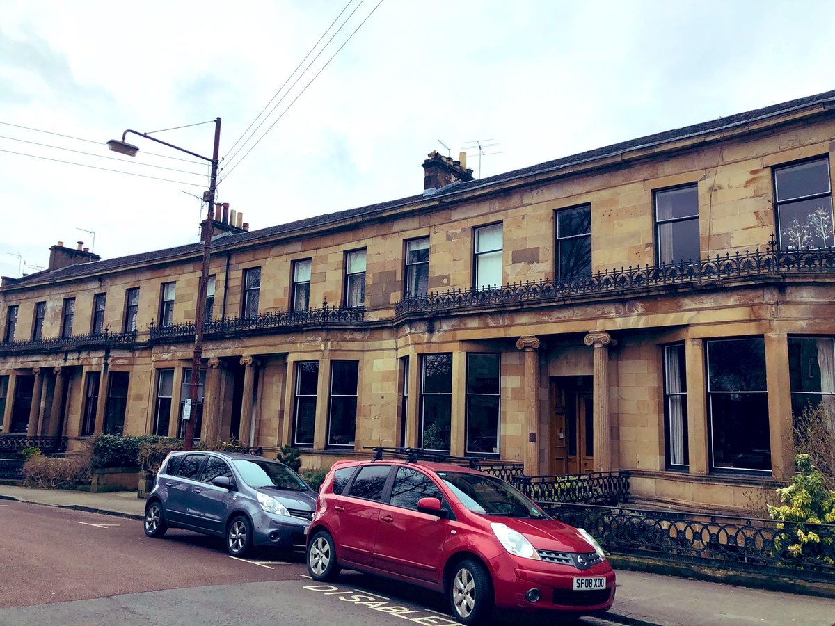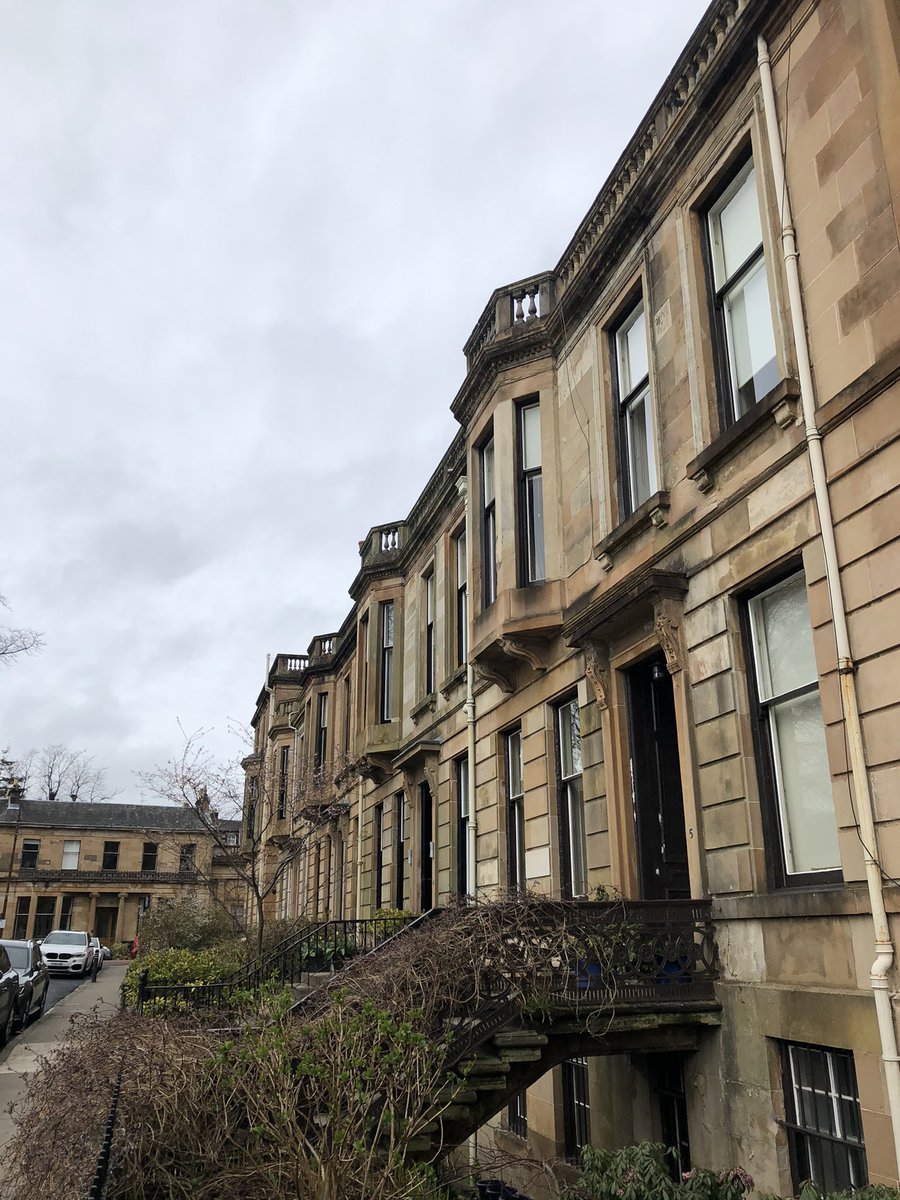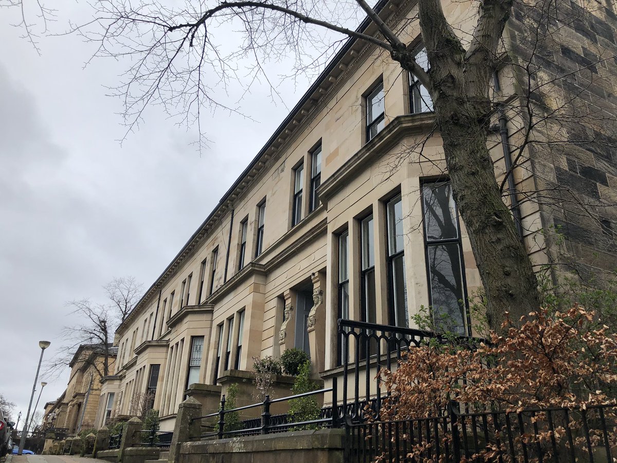 Gently Curving terrace at the east end of Westbourne Gardens, Kelvinside of c1879 which Pevsner thinks is based on a design by Alexander Thomson. Looks like it could be @AThomsonSociety /