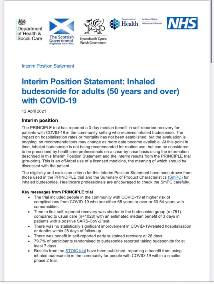 i. O NHS, que reúne os serviços de saúde do Reino Unido, endossou no dia 12 de abril o tratamento pré-hospitalar de covid com budesonida inalada off-label. Isso mesmo, tratamento precoce, aquele que "não existe".