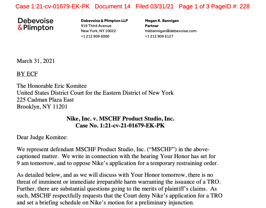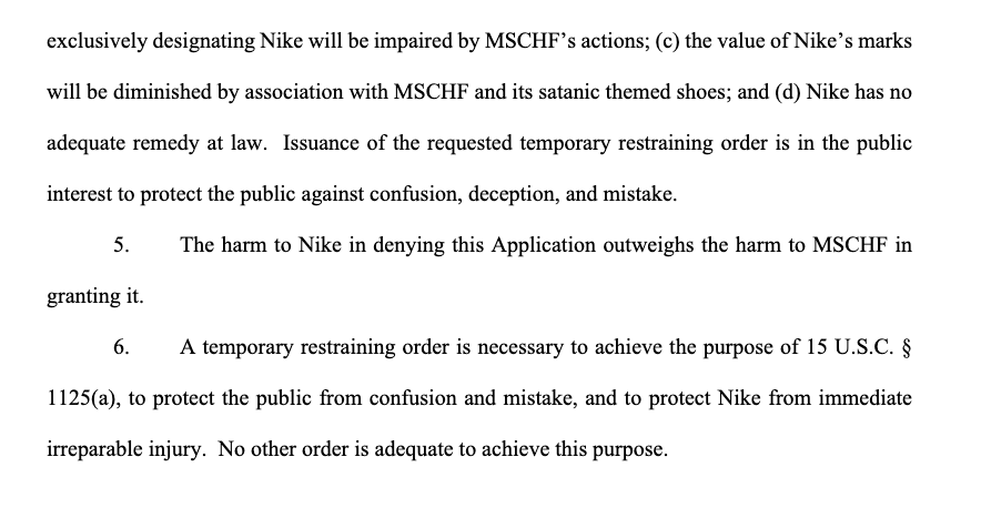 MSCHF's attorneys replied re: the TRO & today's hearing, stating there's no threat of imminent or immediate irreparable harm & substantial questions going to the merits, so the court should deny the TRO & set a briefing schedule on nike’s motion for a preliminary injunction.