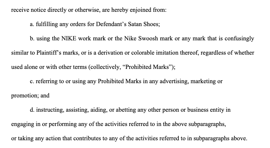 the TRO would enjoin MSCHF from filling any orders for #satanshoes; using the nike word mark or swoosh or any imitations; referring to or using those marks in advertising, marketing or promotion; and aiding or abetting anyone else in using those marks.