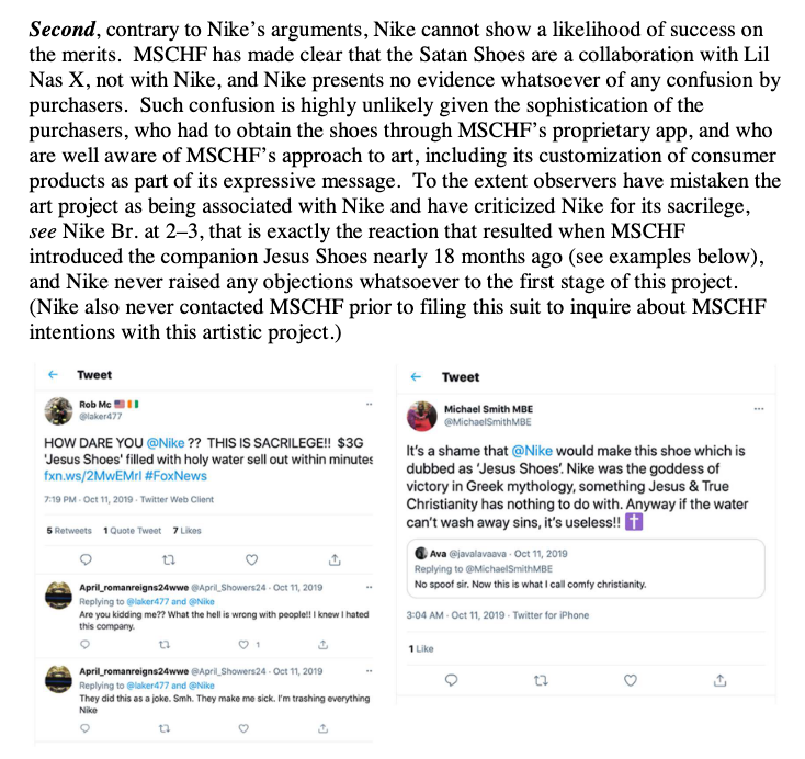 nike alleges not only likelihood of confusion, but "significant" actual confusion already taking place, "incl. calls to boycott nike in response to the launch of MSCHF’s Satan Shoes based on the mistaken belief that Nike has authorized or approved this product." it has receipts.