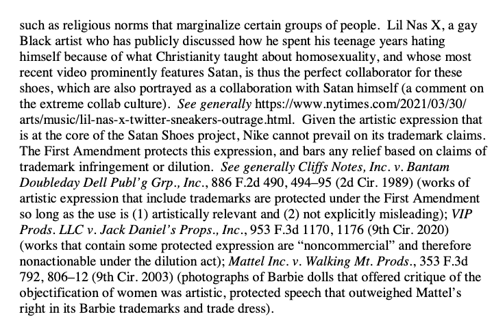MSCHF argues 1st amendment protects #satanshoes, given the artistic expression at their core. it cites barbie in a blender & bad spaniels cases as precedents--while shoes are commercial goods, these contain an expressive message, just like the parodic jack daniel's dog chew toys.