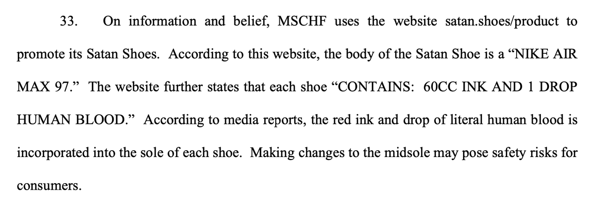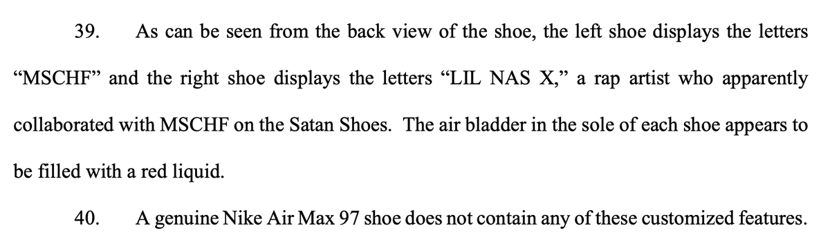 in case you're curious, lil nas x is not only not a named defendant, he barely warrants a mention--the complaint notes that the shoes say "lil nas x" & identifies him as "a rap artist who apparently collaborated with MSCHF on the Satan Shoes."
