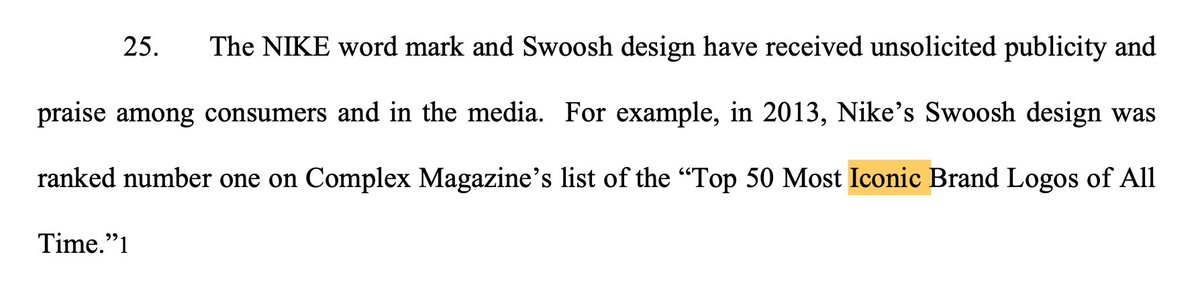 also interesting to note that the (registered, incontestable, famous) marks nike alleges MSCHF infringes & dilutes are the NIKE word mark & the swoosh--no allegation of trade dress rights in the air max '97, which keeps things simpler.