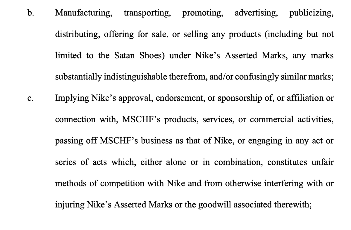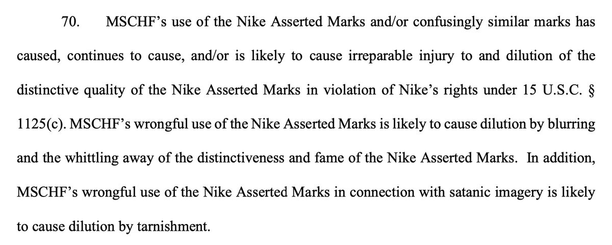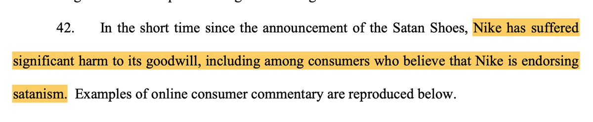 this case: "nike has suffered harm to its goodwill, including among consumers who believe it is endorsing satanism."