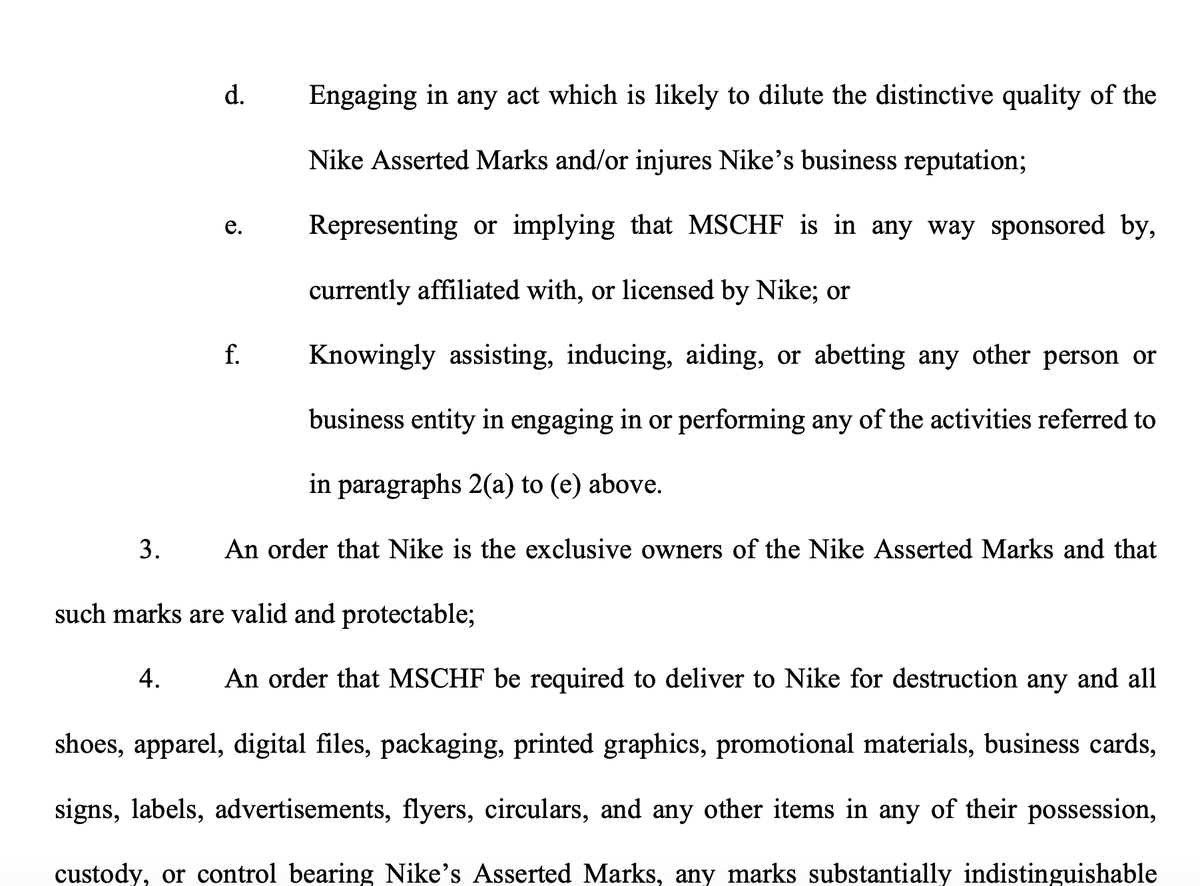 nike wants injunctive relief, destruction of all the shoes, an order affirming nike's TM rights, pre-judgment interest, costs & attorneys' fees, & ALL the kinds of damages (statutory, punitive, profits, treble).