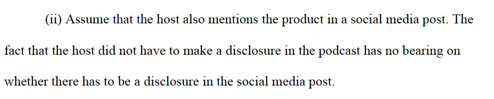 there, disclosure of material benefit may well be required even if it isn't for ads on the podcast paid for by the same brand. b/c consumers are less likely to expect the post is sponcon.